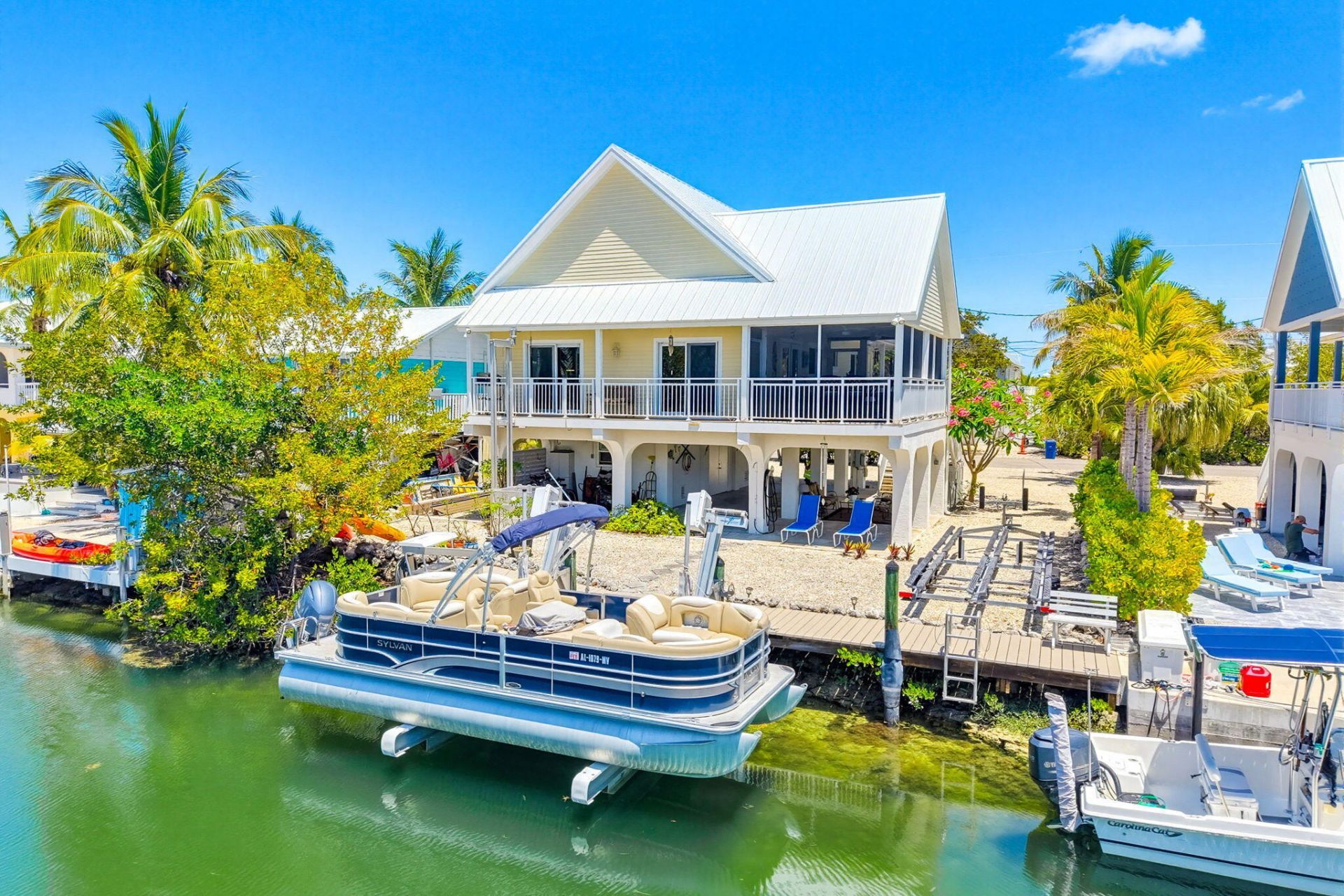 Stunning 3 Bedroom 2 Bath waterfront retreat in sought-after Jolly Rogers subdivision featuring a deep flow-through canal with quick boating access, a Trex dock, 15,000 lb boat lift, permitted cargo lift. Built for durability and peace of mind with impact windows and doors, Hardie board siding, aluminum railings, and low-maintenance Trex decking throughout, standing seam metal roof.Inside, the home offers vaulted wood ceilings, a spacious upstairs primary suite with his-and-her walk-in closets, vaulted ceilings in the primary bedroom and bath, Berber carpet upstairs, and abundant closet space throughout. The updated 2025 kitchen features granite countertops, deep stainless sink, and new dishwasher, refrigerator, and microwave. Additional highlights include a new 4-ton A/C (2025), washer and dryer, Enjoy outdoor living from the front and rear wraparound porches, plus a screened front porch with fans, Coolaroo shades, and vaulted ceiling. The low-maintenance rock yard is beautifully landscaped with pink frangipani, gorgeous orchids nestled in palm trees, and double bougainvillea.Enclosed garage, and covered parking for two vehicles.